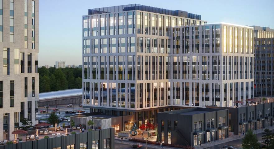 Шесть скоростных лифтов с системой распознавания пассажиров и один сервисный свяжут офисную зону с торговой, которая будет расположена на первом этаже здания. Здесь разместятся кафе и другие коммерческие объекты с витринами «в пол». Перекусить можно будет не только в этих заведениях, но и не отходя от рабочего места: в каждом из офисов предусмотрена своя кухня. Еще 290 кв. м первого этажа займет сквозное лобби с двумя входами. Один из них ведет к станции метро «Прокшино», второй — в благоустроенный двор, который украсят арт-объекты и арки с подсветкой (в вечернее время подсвечен будет и весь фасад здания).